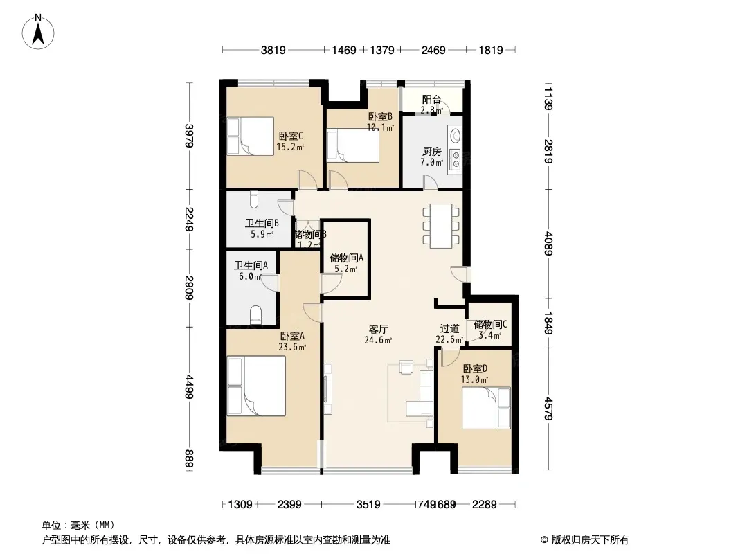 格局方正,动静分区清晰:四居室空间规整无拐角,户型利用率高;生活区与休息区划分明确,客厅、餐厅等公共区域开阔,会客娱乐互不打扰,卧室等私密区域静谧舒适,适配三代同堂或多孩家庭的居住需求。 双明卫设计,居住体验升级:两个卫生间均带独立窗户,告别阴暗潮湿,通风采光俱佳,能有效减少细菌滋生,保持空间干爽洁净;早晚高峰可分流洗漱需求,避免拥挤,大幅提升生活效率,私密性与实用性双在线。通透采光,畅享舒适生活. 户型多面采光,室内通透明亮,客厅与卧室均能沐浴充足阳光;空气流通性好,可保持室内干燥清新,减少闷热感,打造宜居的居家环境。