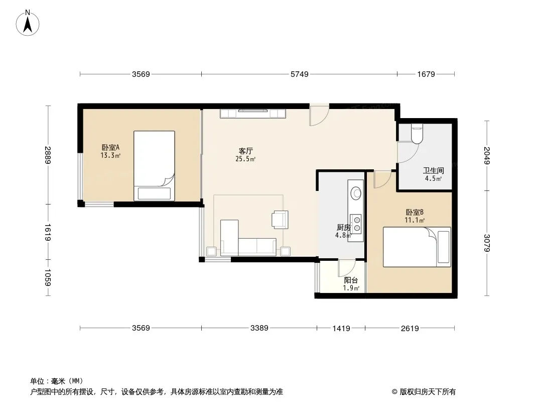 易构空间 精装修 对花园 两居室户型方正