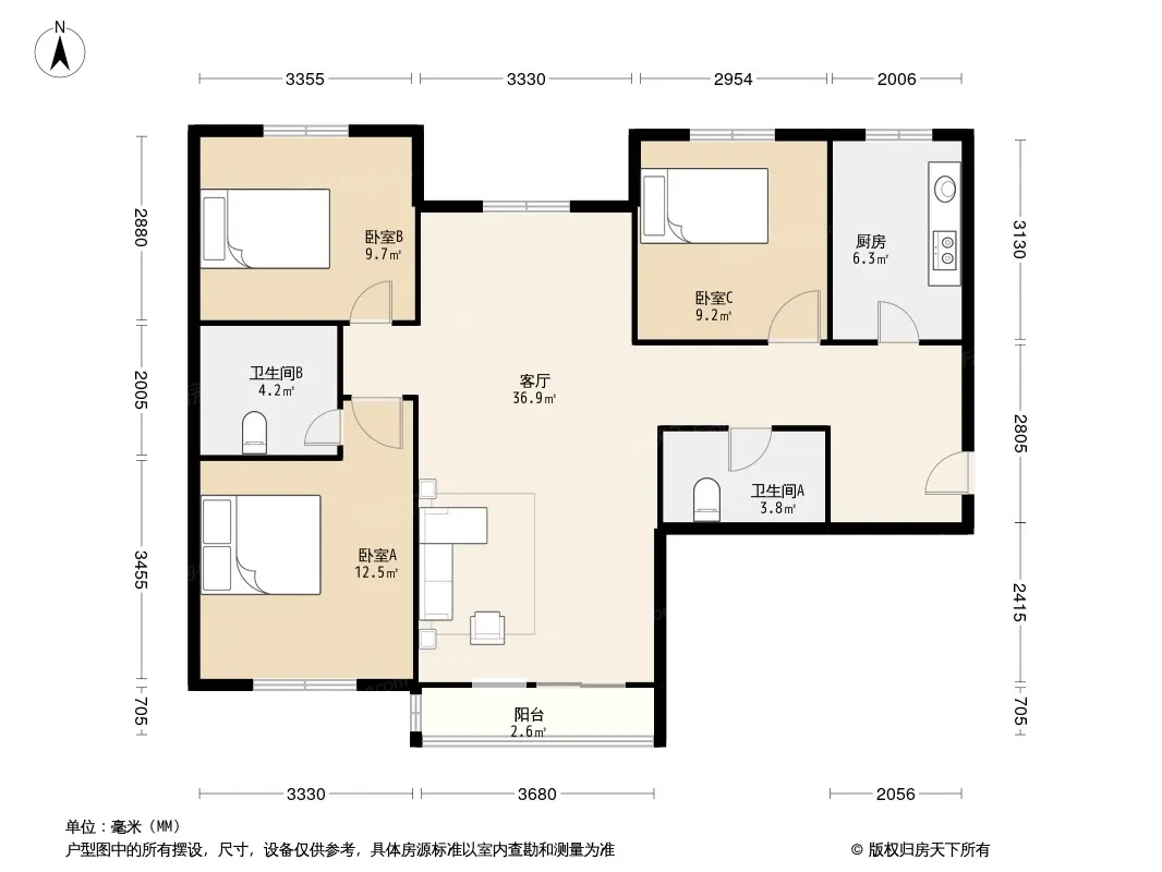 户型齐全,主打户型方正,明厨,客厅朝南三居