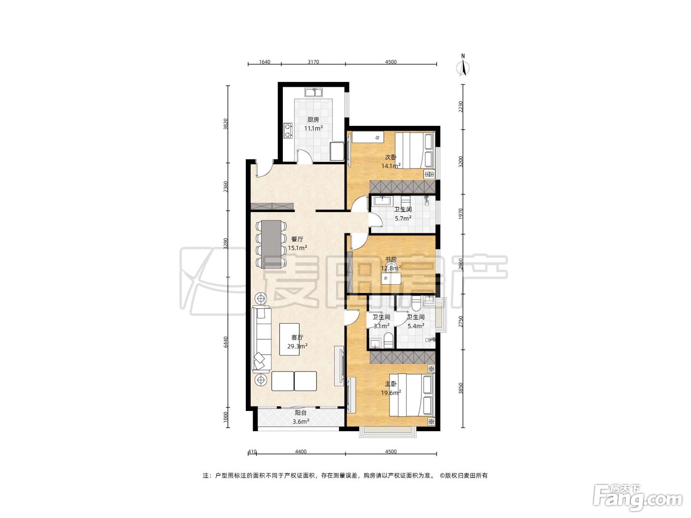 户型方正,客厅有40平米,比较舒适,两个卫生间全都是明的