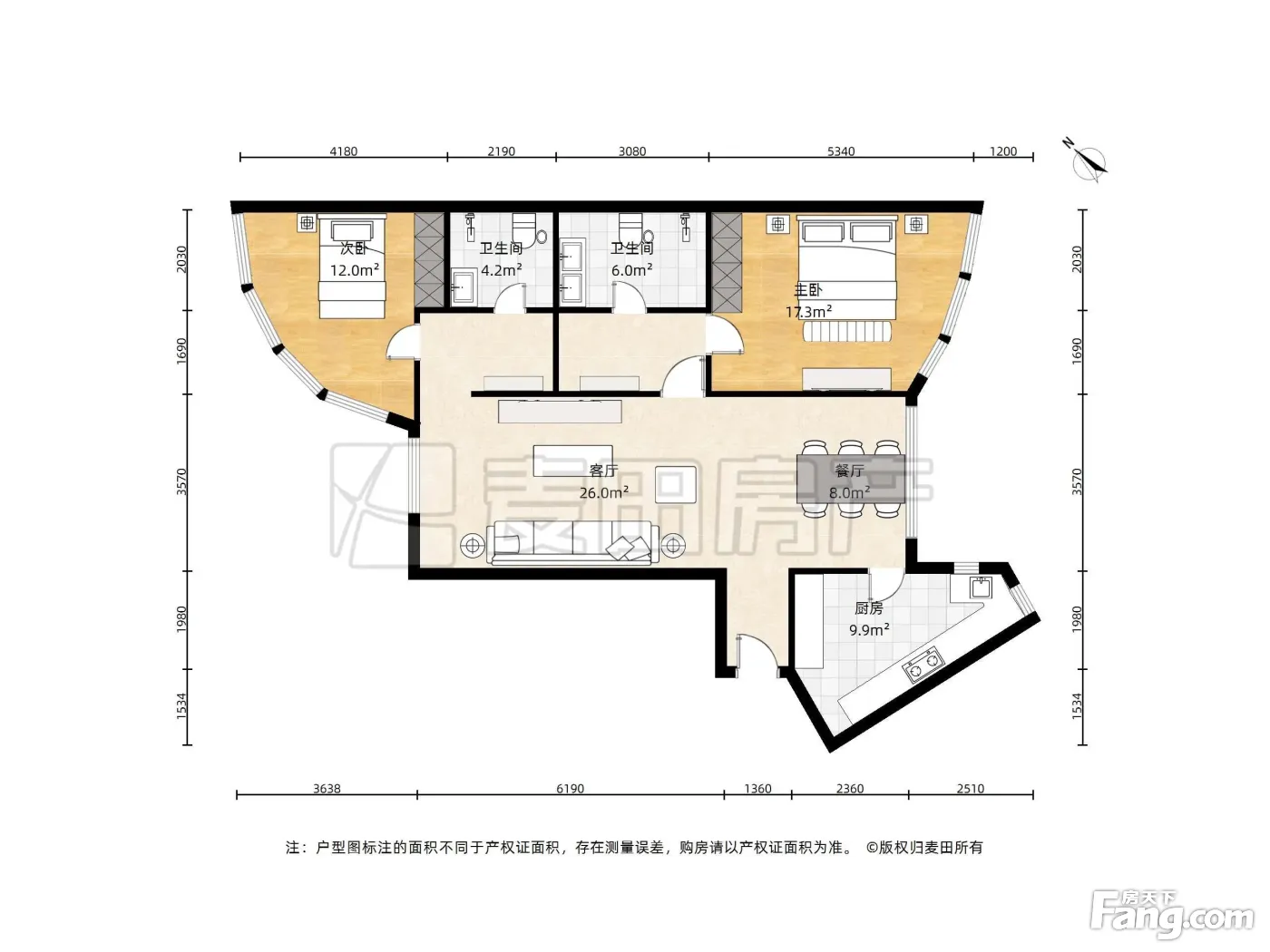 户型齐全,主打明卫,独立衣帽间,明厨,客厅朝南,双阳台三居