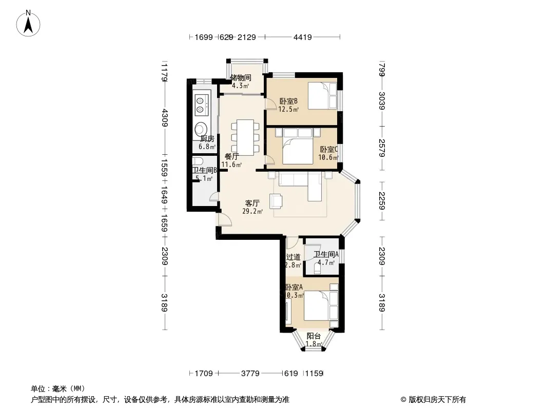 户型齐全,主打独立衣帽间,主卧朝南三居