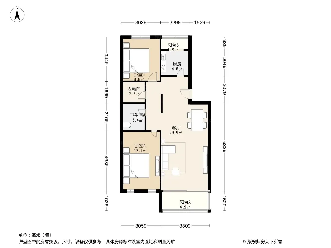 户型齐全,主打户型方正,独立衣帽间,双阳台,主卧朝南二居