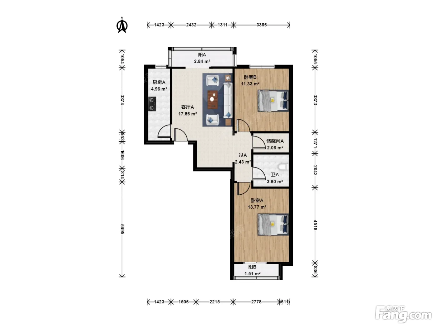 户型介绍:此房为南北向两居室,面积为96.49平米,客厅主卧朝南,次卧朝北