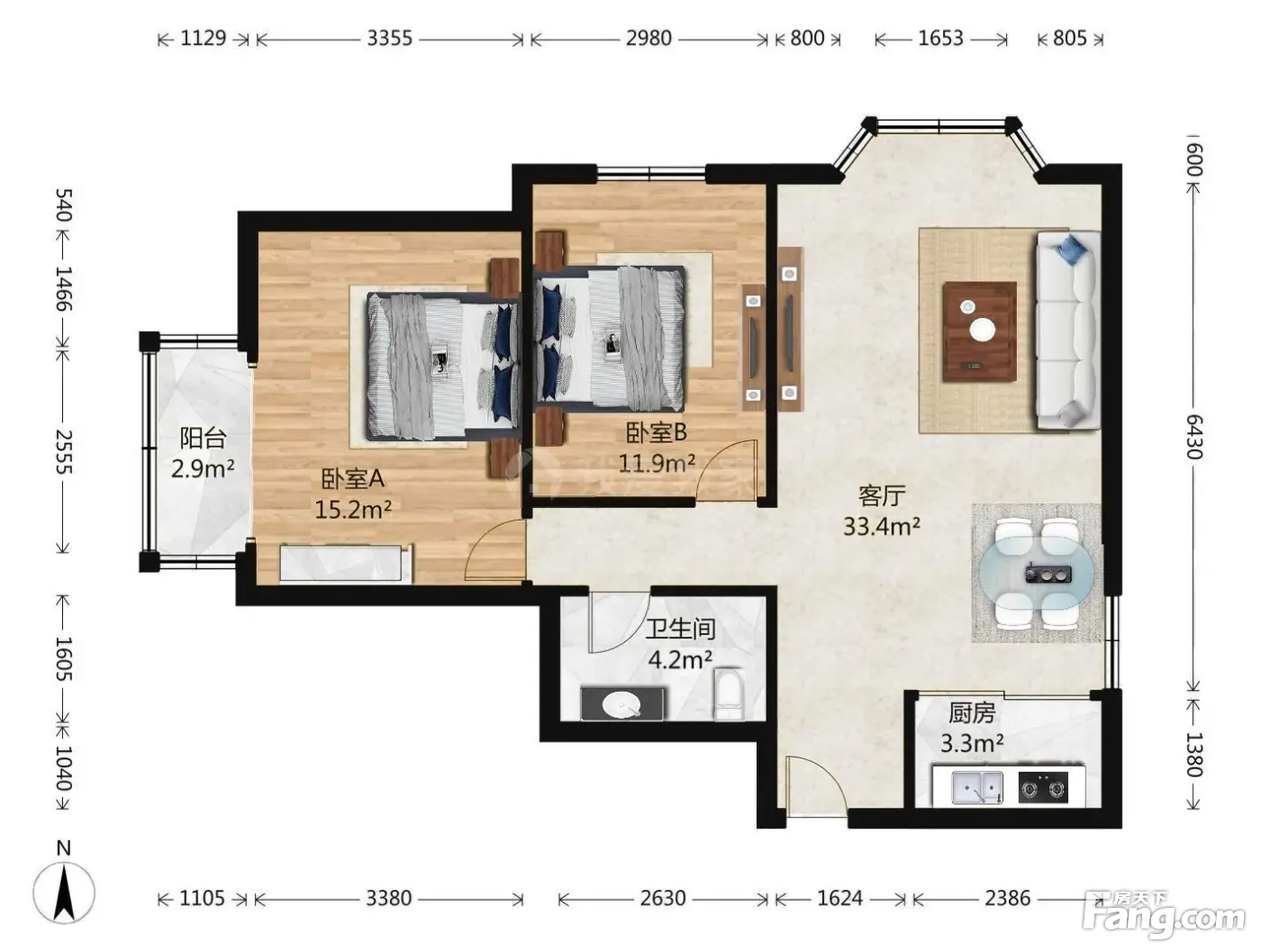 户型齐全,主打客厅朝南二居