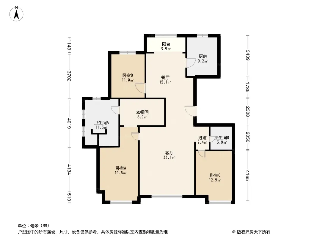 户型齐全,主打户型方正,独立衣帽间,明厨,明卫三居