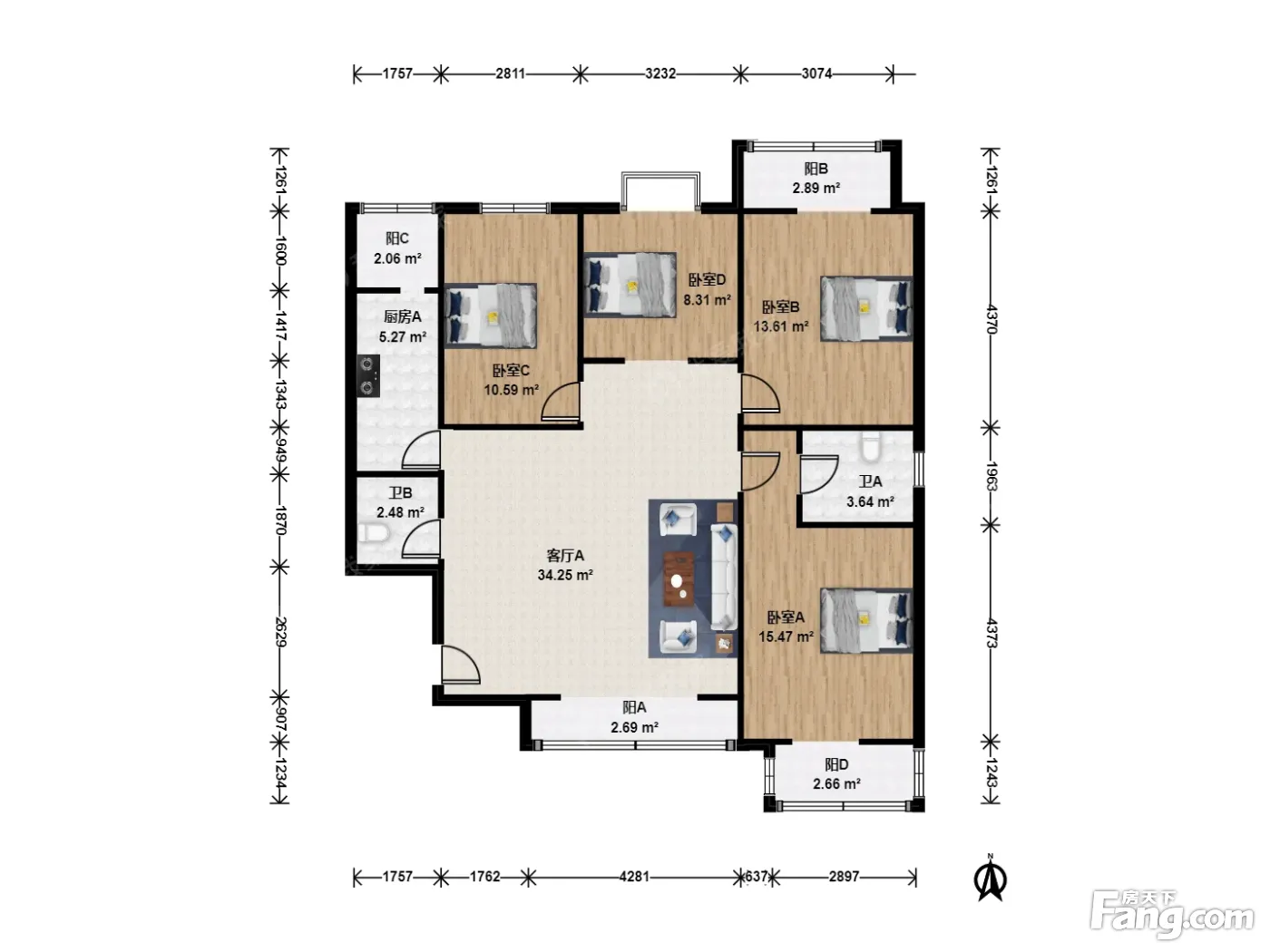 空港吉祥花园 4室1厅 南 北