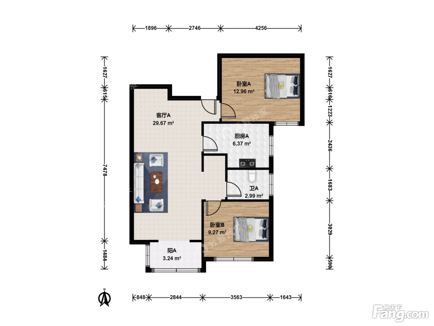 户型齐全,主打户型方正,明厨,主卧朝南二居
