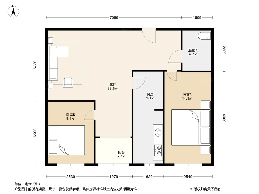 户型齐全,主打明厨,主卧朝南二居
