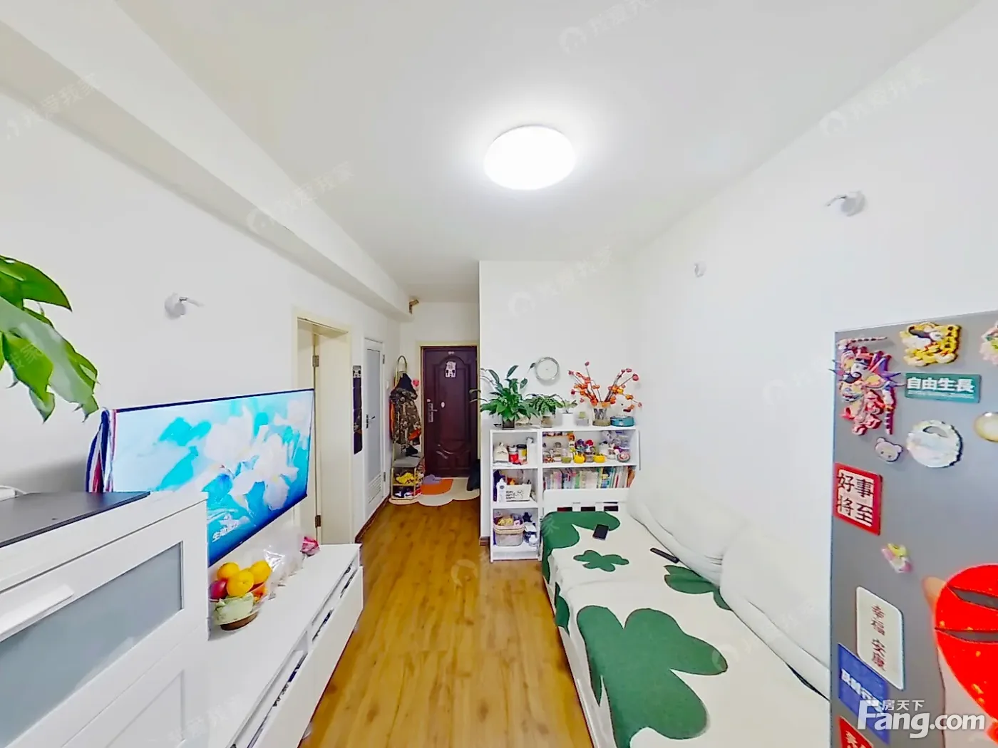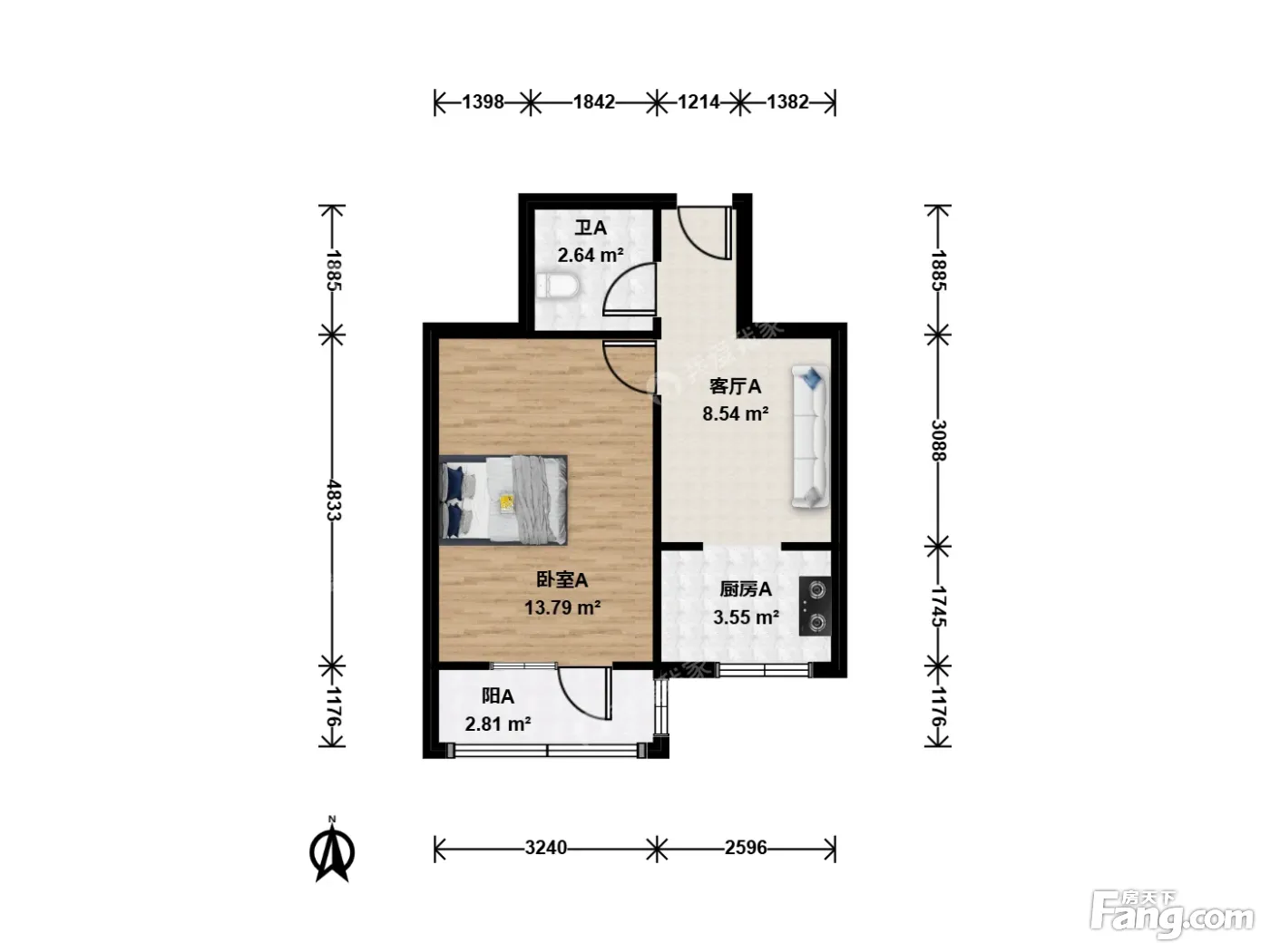 户型介绍:朝南向正规一居室,一进门是客厅,主卧室带阳台朝南,厨房朝南,户型方正,客厅能放一张床,住三口人没问题。