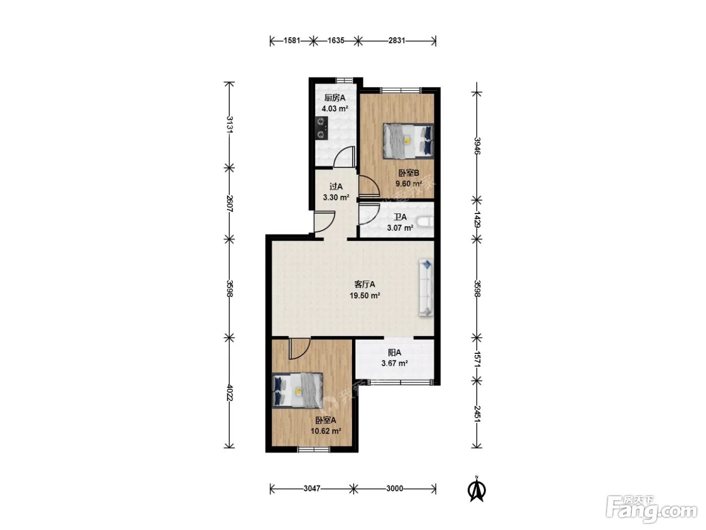 此房户型方正 板楼 公摊小 一层 南北通透 2居室 布局合理 无浪费面积 采光无遮挡