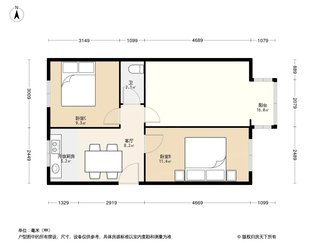 户型齐全,主打户型方正,明厨,主卧朝南二居