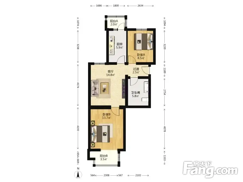 户型齐全,主打双阳台,主卧朝南二居