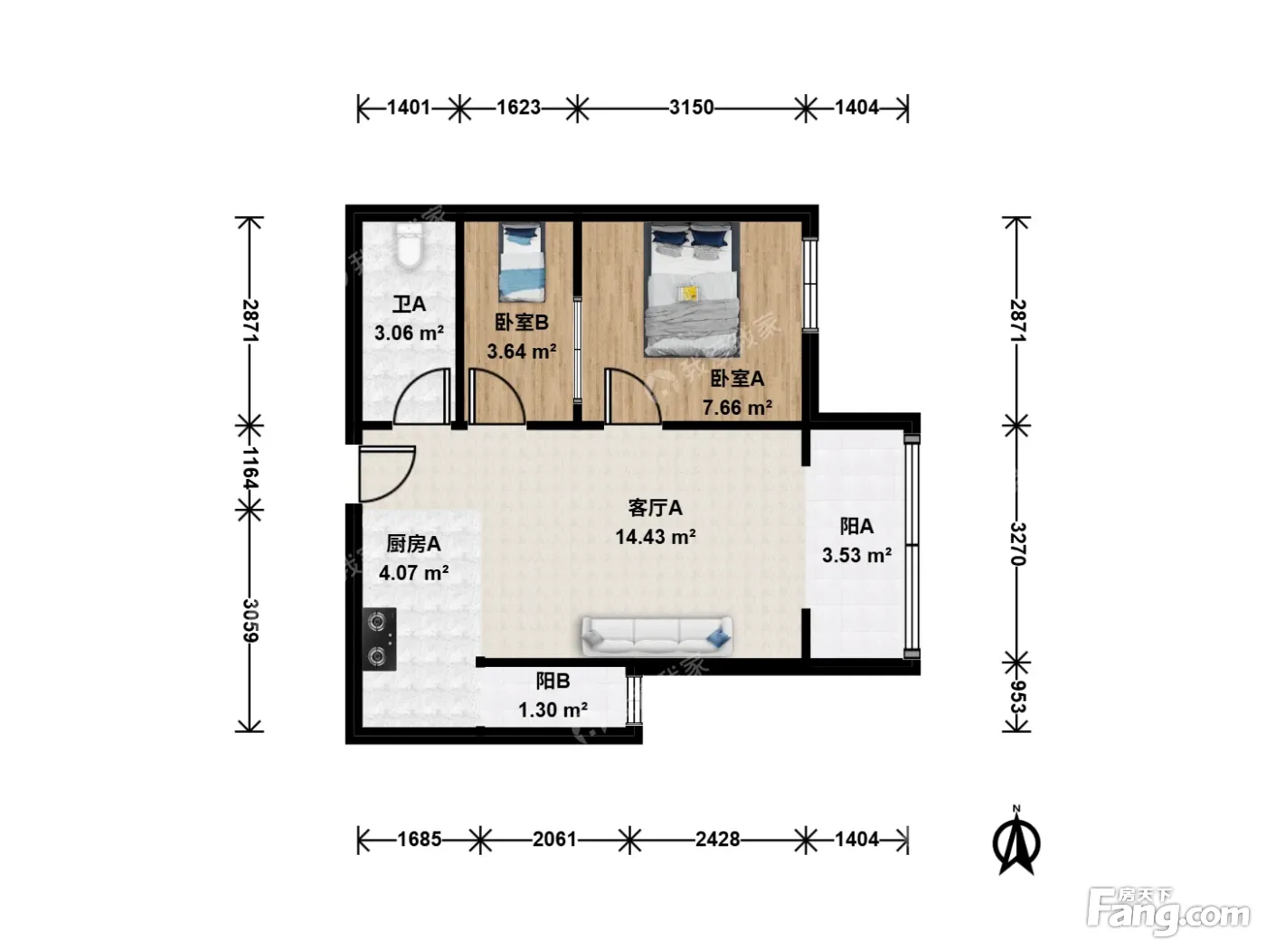 户型齐全,主打明卫,客厅朝南,双阳台二居