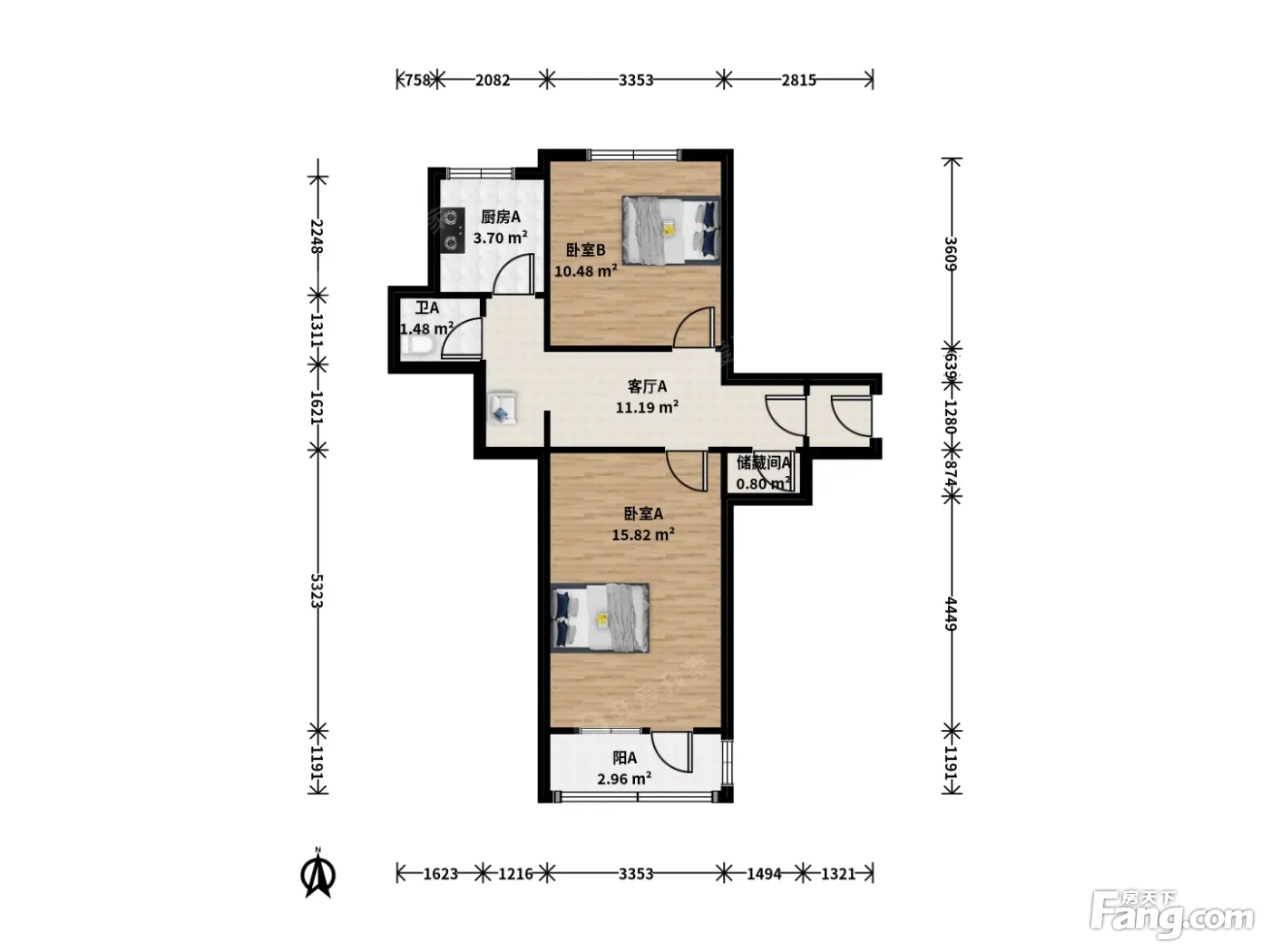 户型介绍:此房户型为2室1厅1卫,建筑面积为59.99平米,南北通透的两居室,南向卧室带阳台,北向次卧和客厅中间墙体不承重,可以根据自生需求调整大小,厨房朝北。