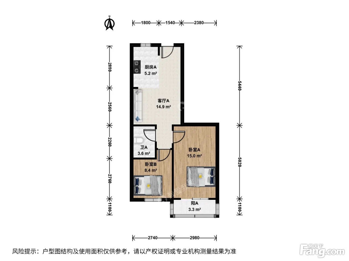 户型介绍:此房户型为2室1厅1卫,建筑面积为63.1平米。户型是南北向的两居,主卧室朝南,次卧室也朝南,两间卧室私密性很好,通风好。