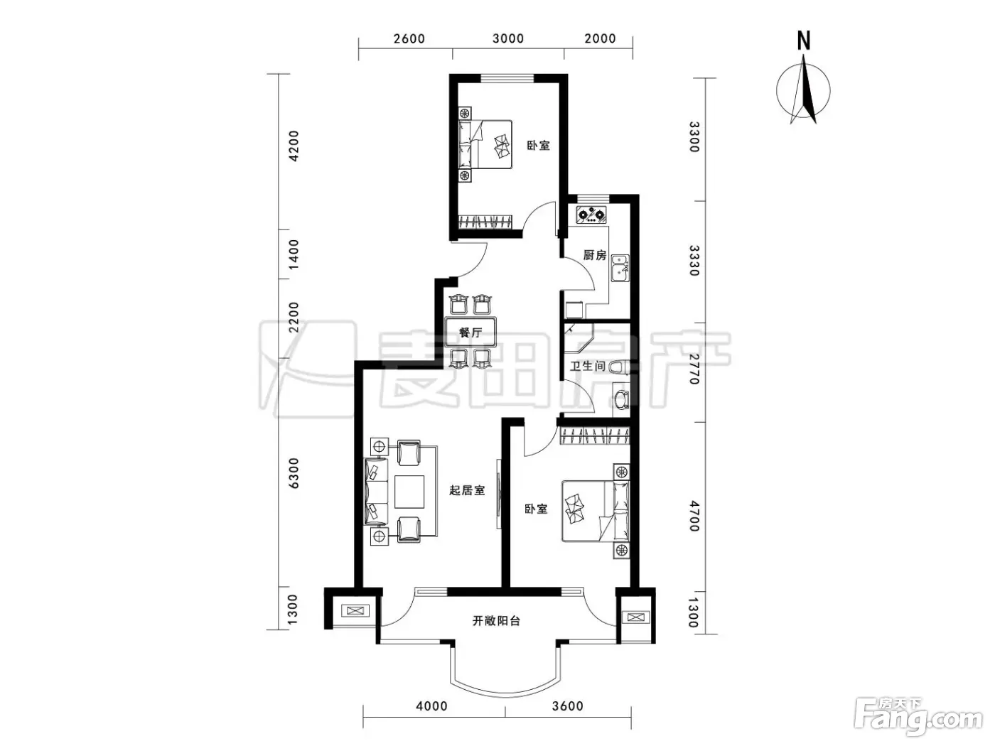 户型齐全,主打户型方正,明厨,客厅朝南,主卧朝南二居