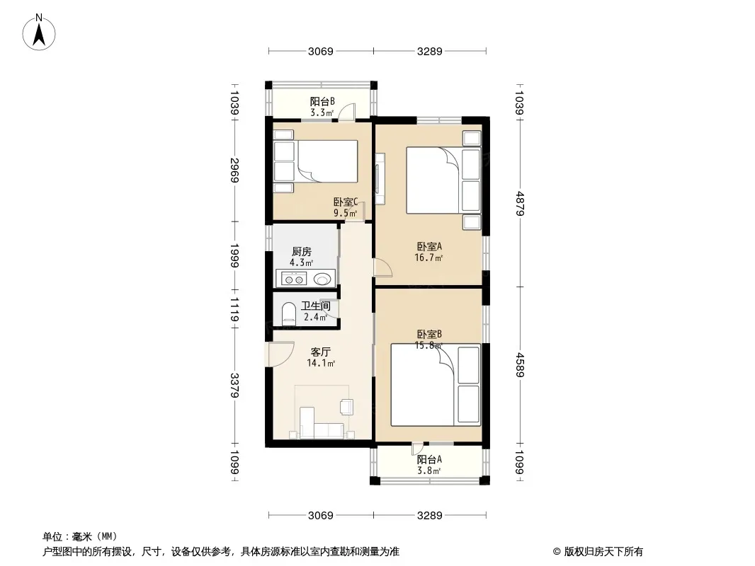 户型齐全,主打户型方正,明厨,主卧朝南二居