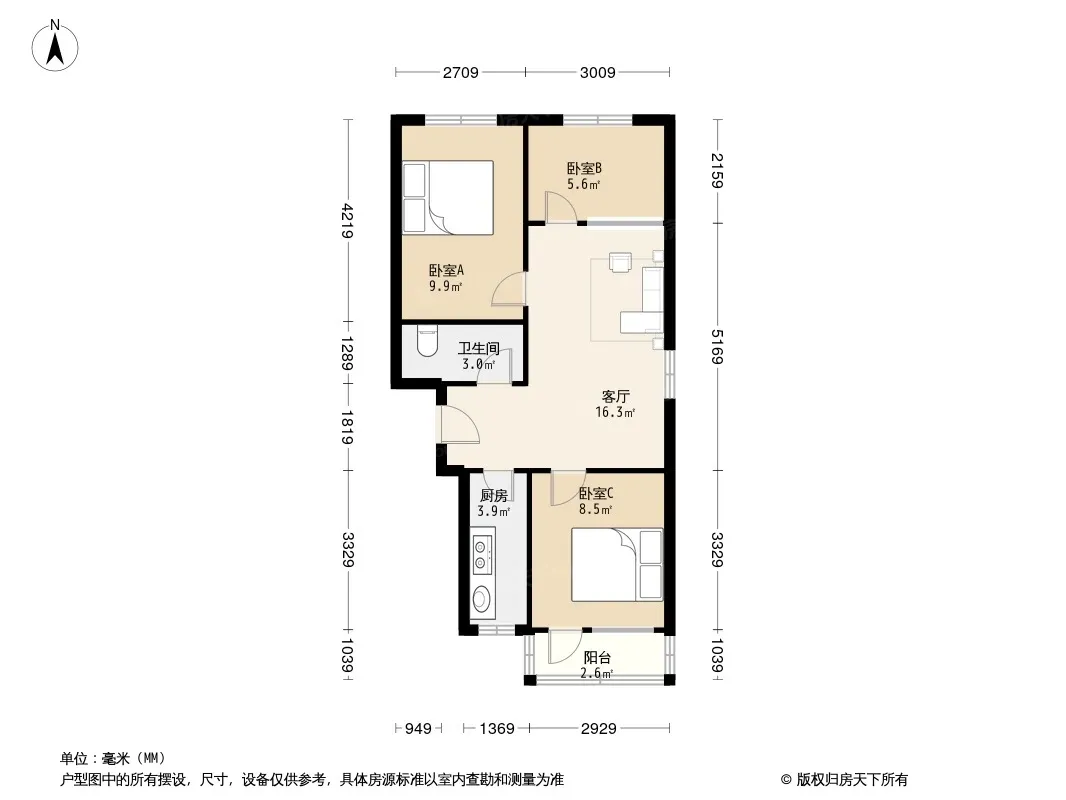 户型齐全,主打明厨,客厅朝南二居