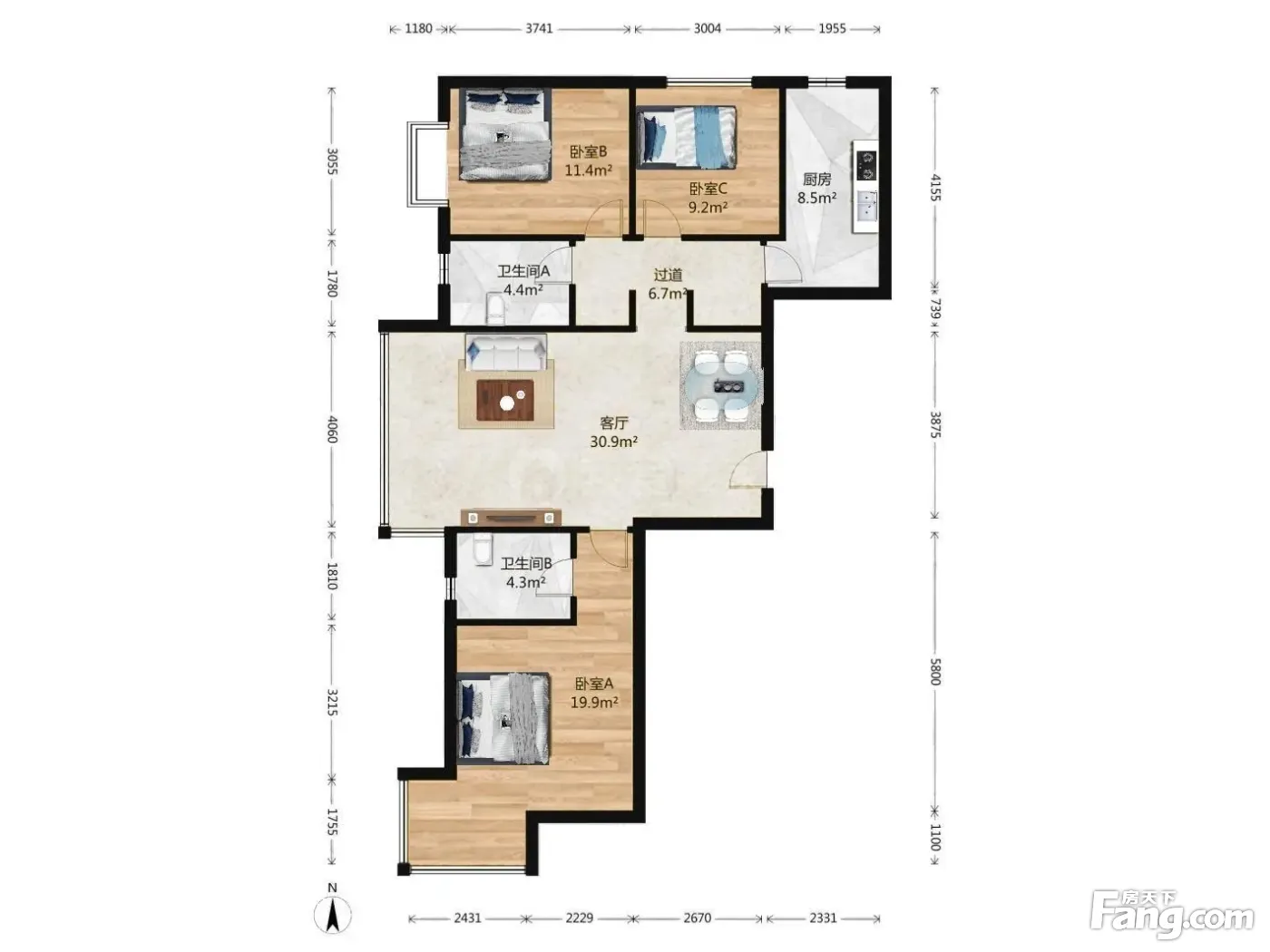 户型介绍:西南北三居 户型分布合理