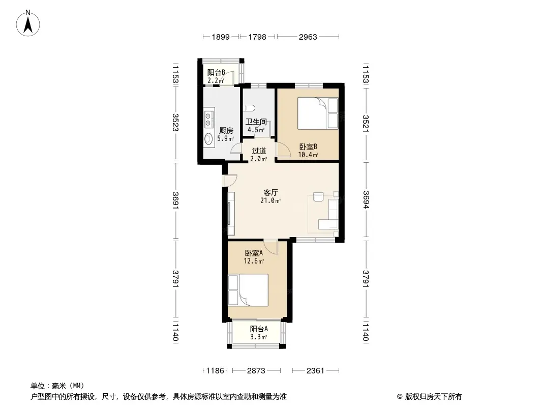 户型齐全,主打户型方正,明厨,明卫,客厅朝南,双阳台二居