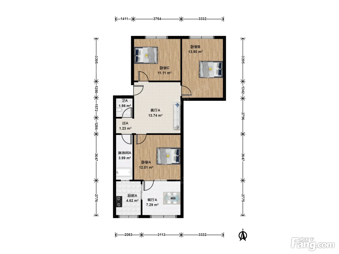 户型介绍:此房户型为3室1厅1卫,建筑面积为75.99平米,朝向为南北。