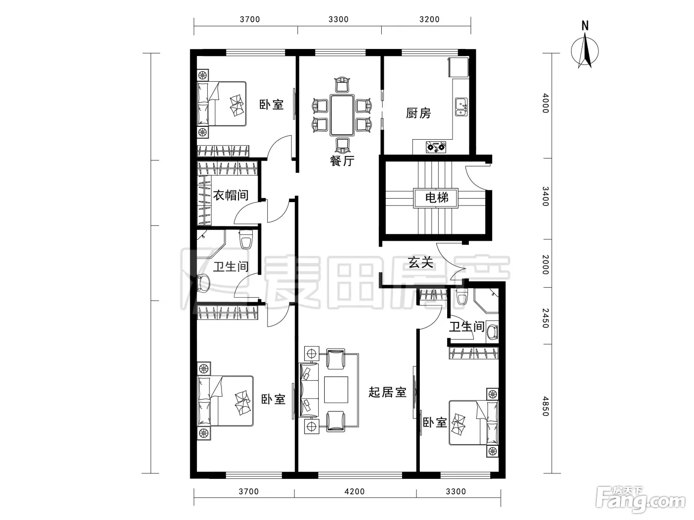 、200平-498平的户型方正,明卫,独立衣帽间,明厨,客厅朝南,全明格局,双卧朝南,主卧朝南的四居