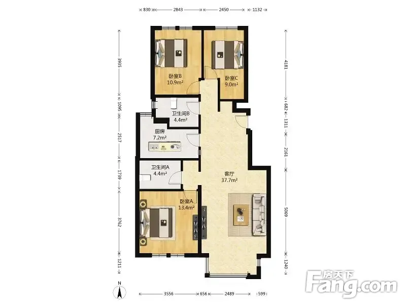 户型介绍:南北通透三居室,主卧客厅南向,独立阳台,双次卧北向,双卫户型