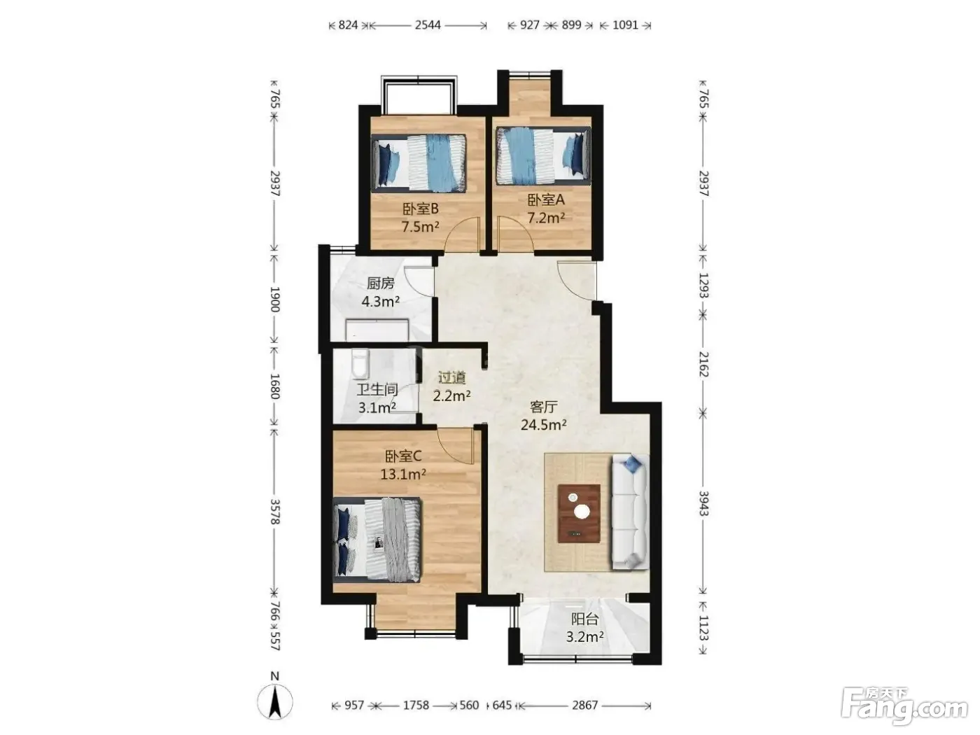 户型介绍:南北通透三居室,进门大客厅,主卧客厅朝南采光充足,两个次卧朝北,格局合理,无浪费空间