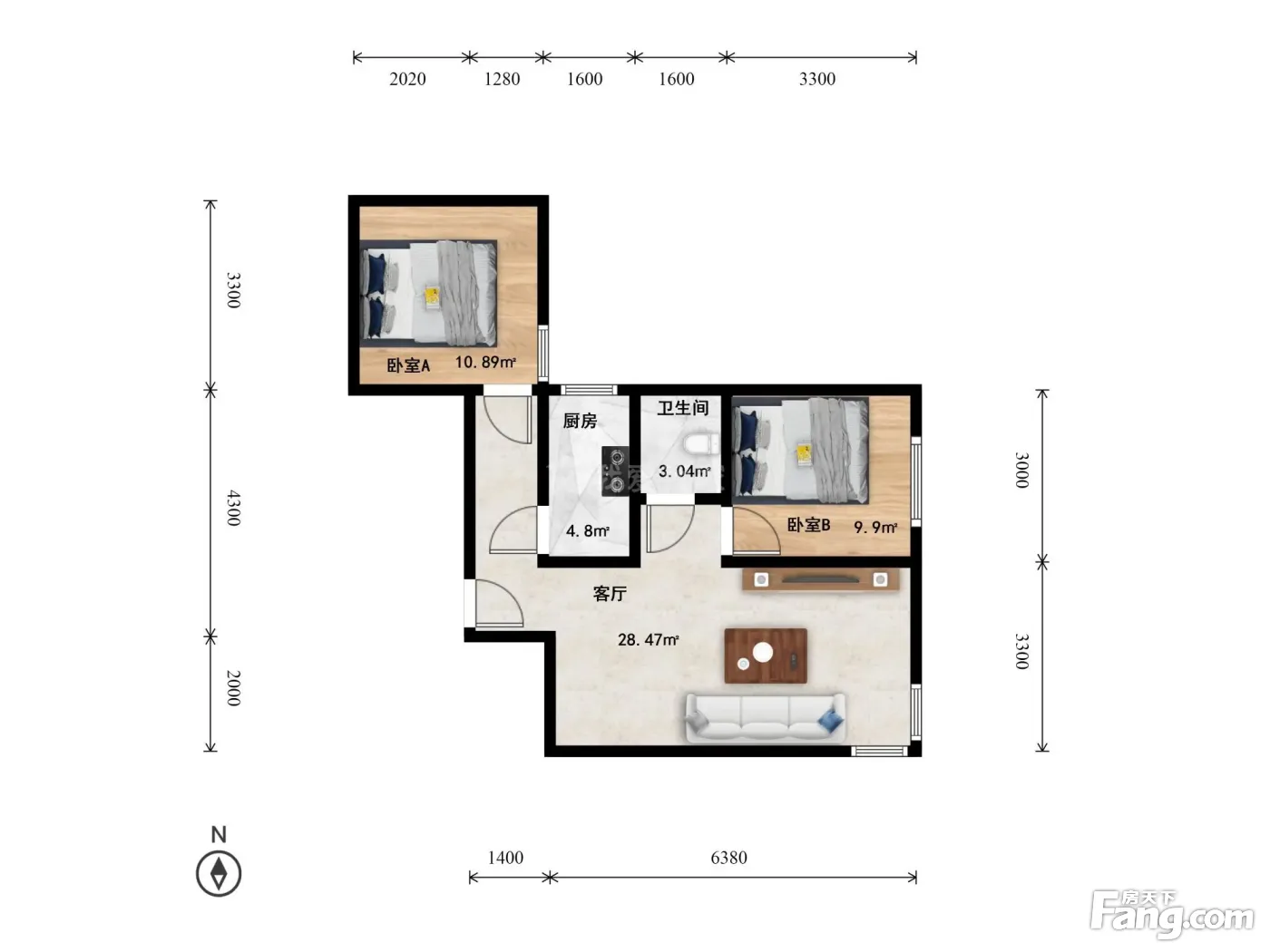 户型齐全,主打明厨,客厅朝南,双卧朝南二居