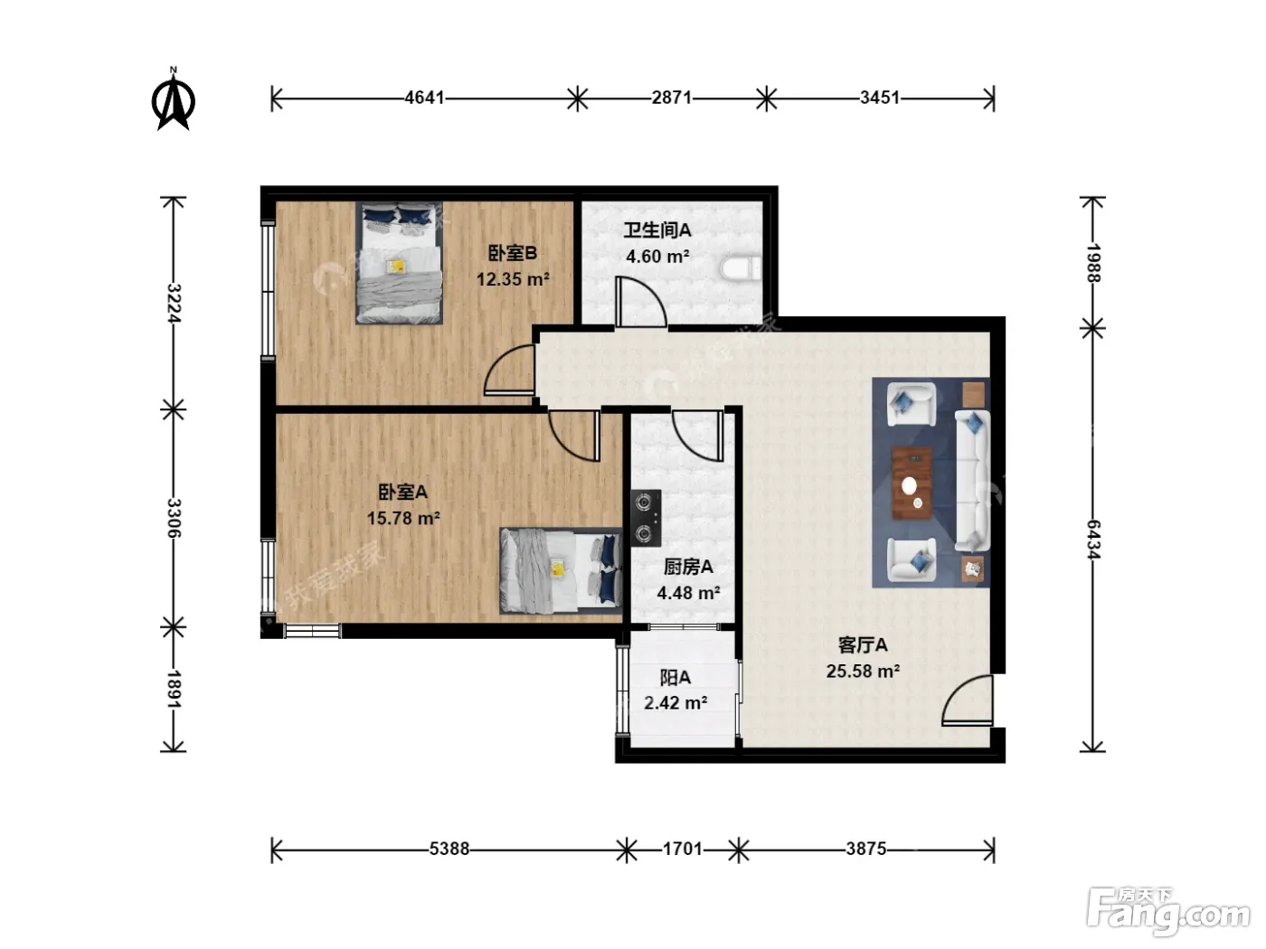 户型齐全,主打明厨,客厅朝南,双卧朝南二居