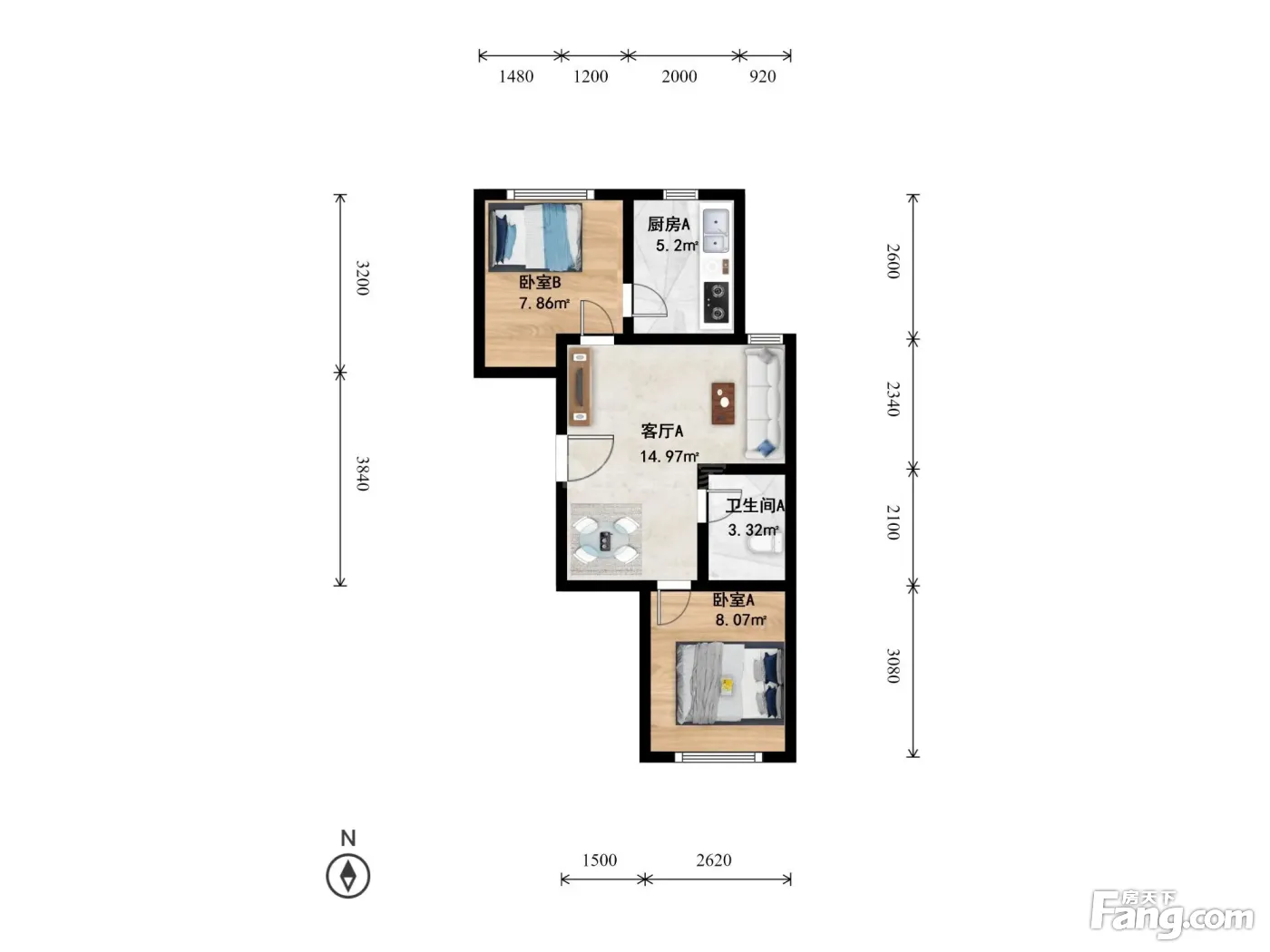 户型齐全,主打明厨,客厅朝南,双卧朝南二居