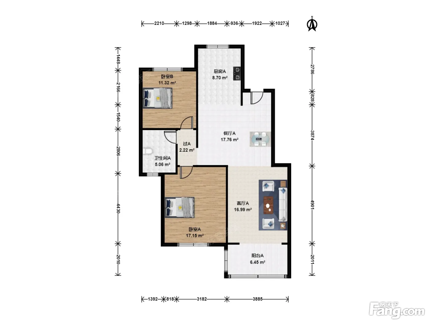 户型介绍:此房两室两厅一卫,全明户型