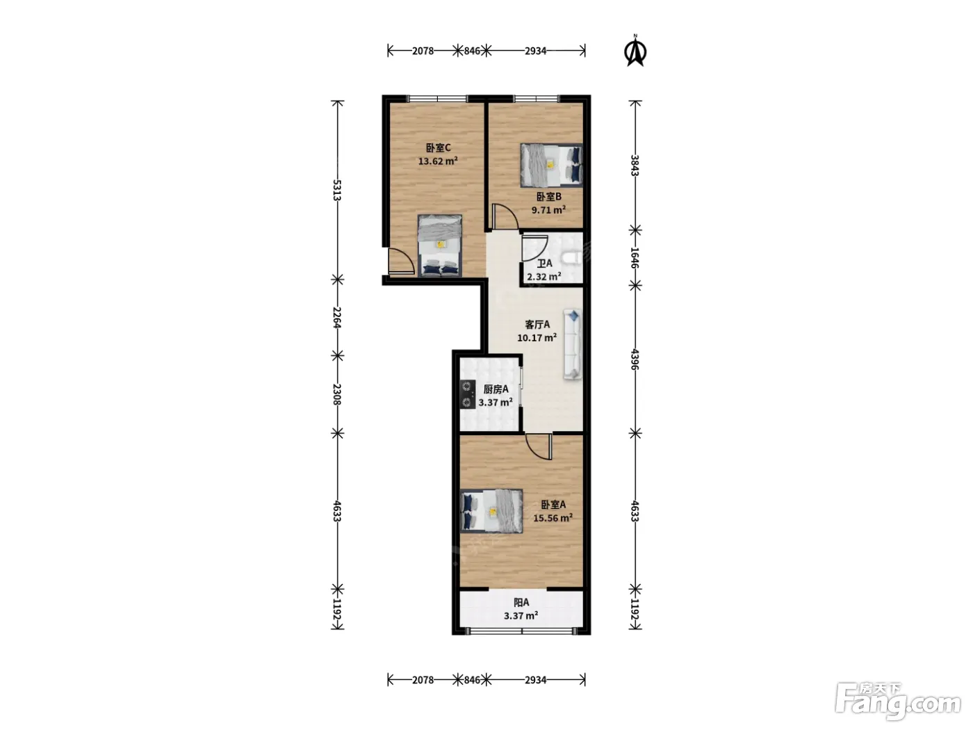 户型介绍:房子正规三居室,主卧朝南,厨房次卧朝北,采光视野好