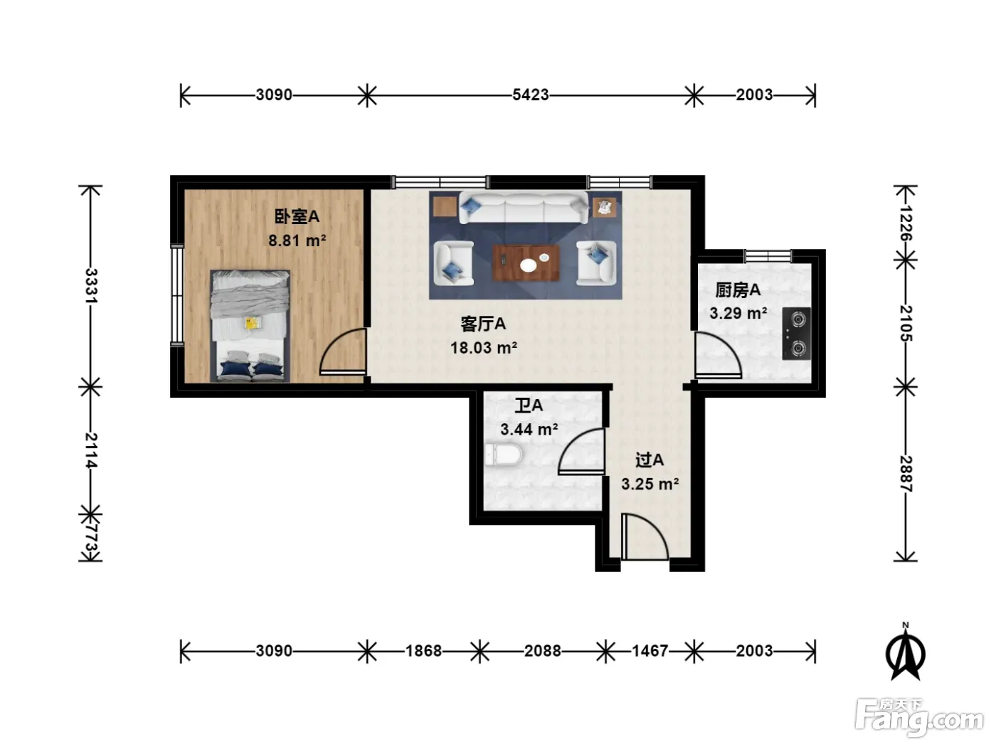 户型介绍:此房户型为1室1厅1卫,建筑面积为54.17平米,朝向为西北。