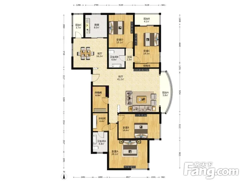 户型齐全,主打户型方正,明卫,明厨,客厅朝南,全明格局,双阳台四居