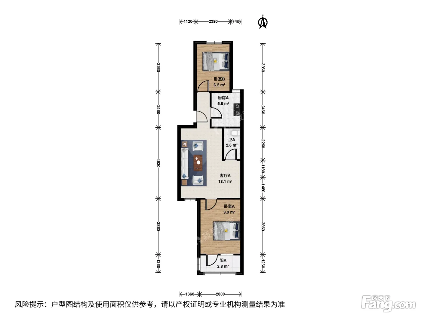户型齐全,主打明厨,客厅朝南,主卧朝南二居