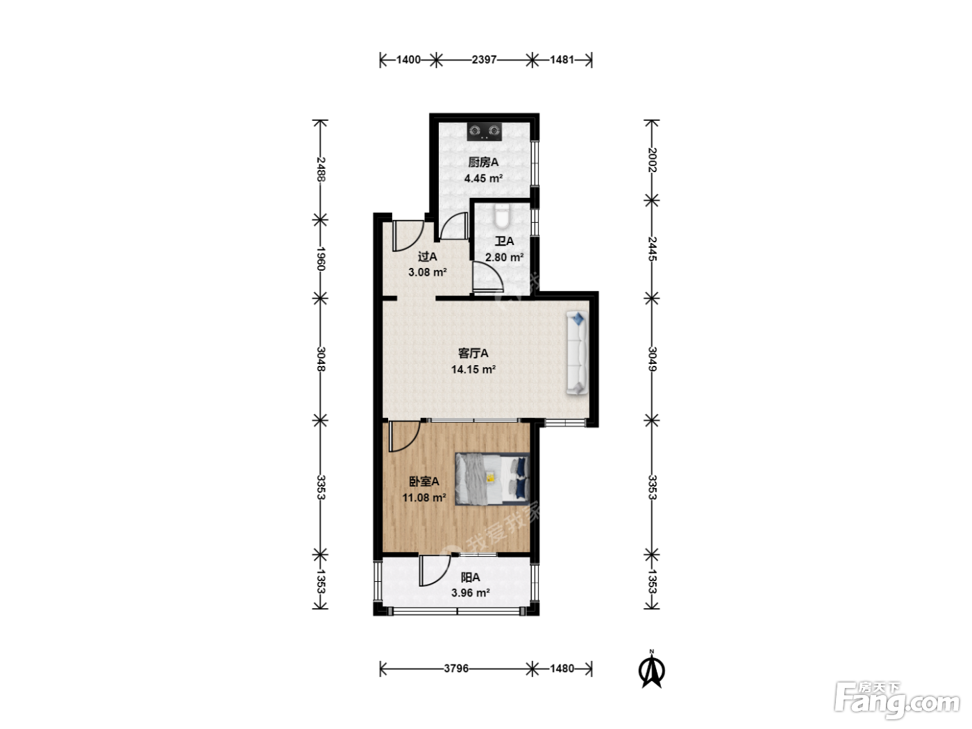 户型齐全,主打明厨,明卫,客厅朝南,双阳台二居
