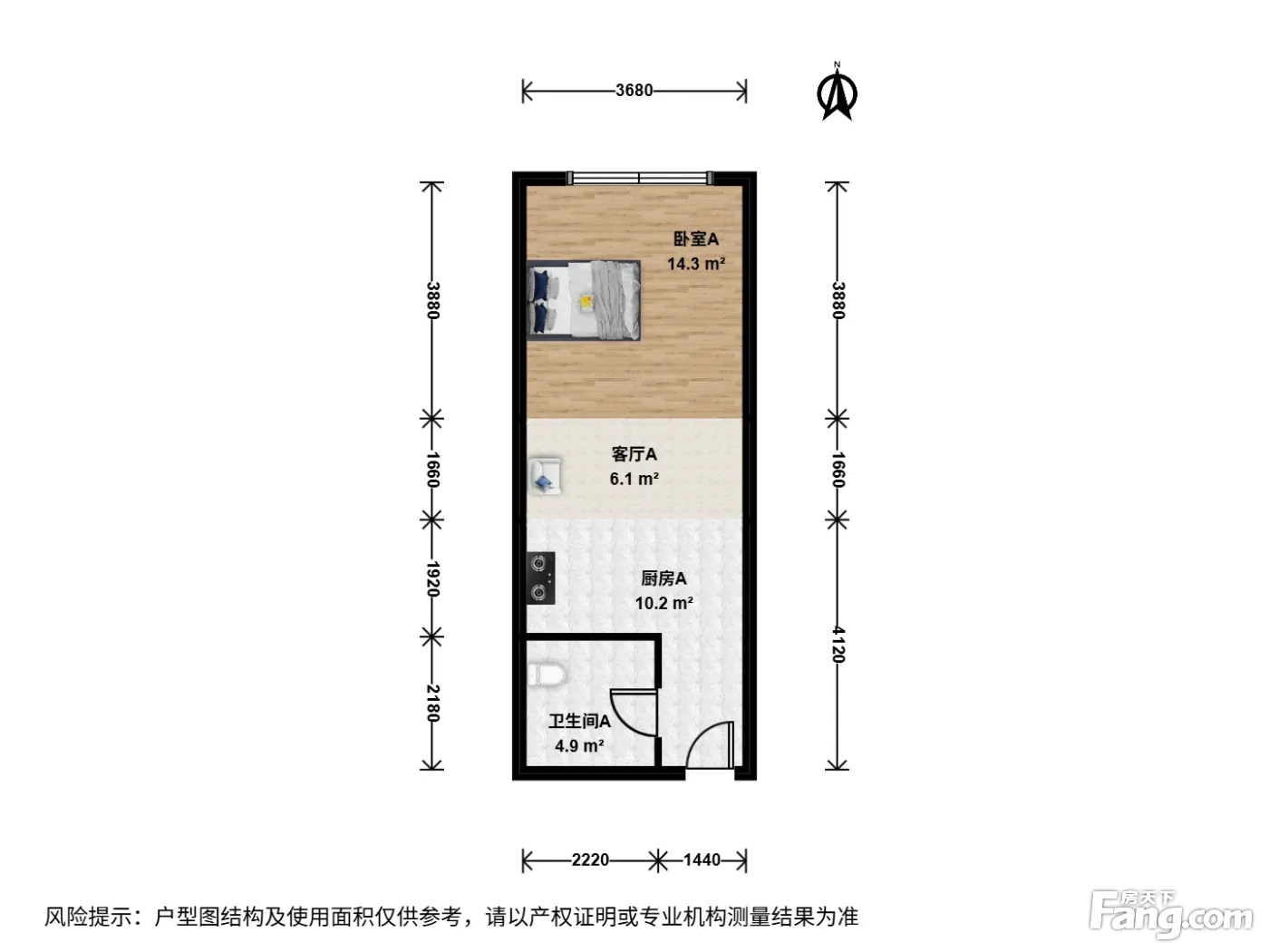 户型介绍:此房户型为1室1厅1卫,建筑面积为59.16平米,朝向为北。房子进门左右卫生间 ,干湿分离,厨房是开放式厨房 层高3米 ,空间感强。景观视野好!