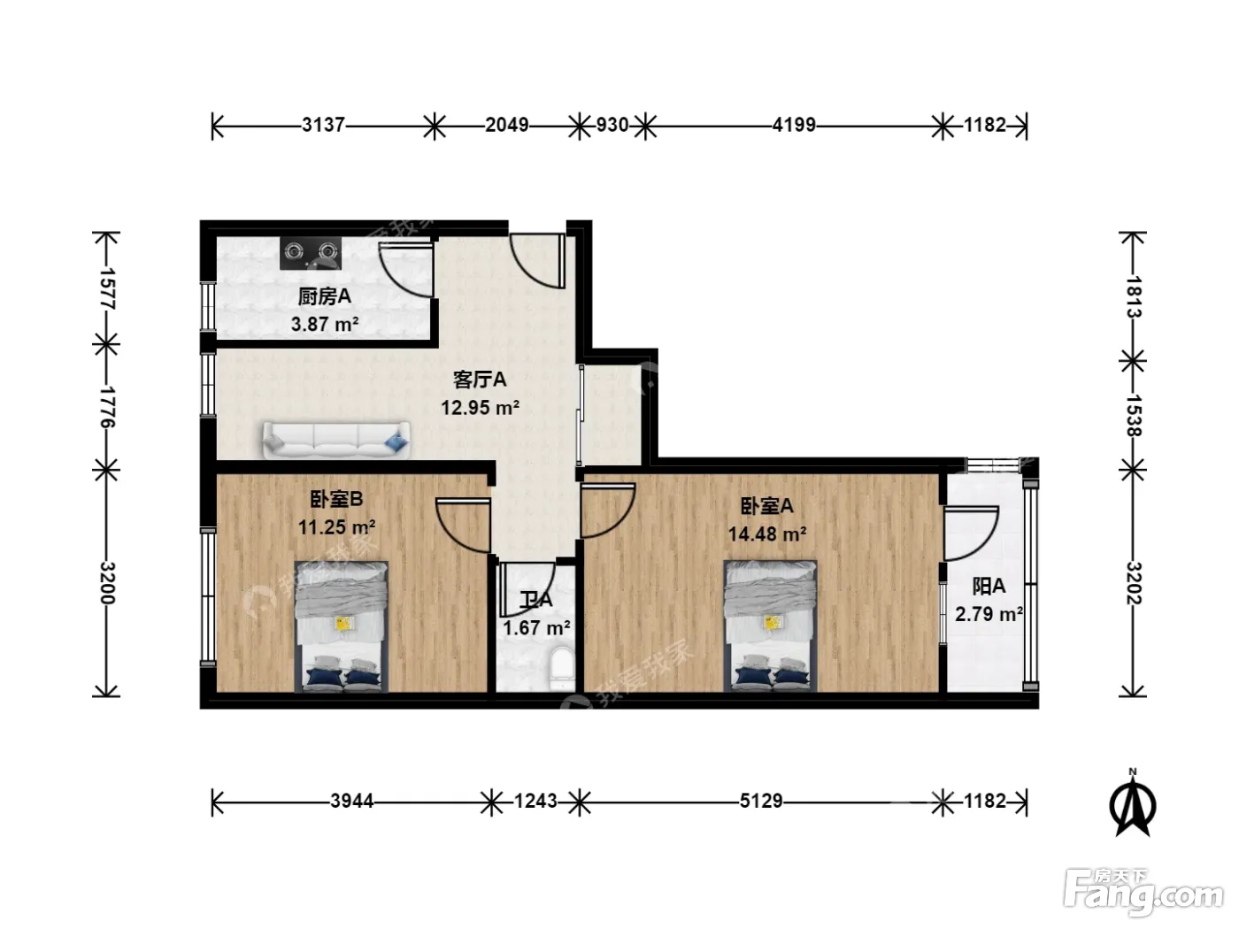 户型齐全,主打明厨,客厅朝南二居