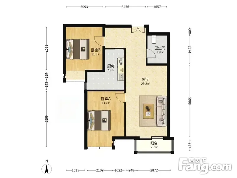 户型齐全,主打户型方正,明厨,客厅朝南,主卧朝南二居