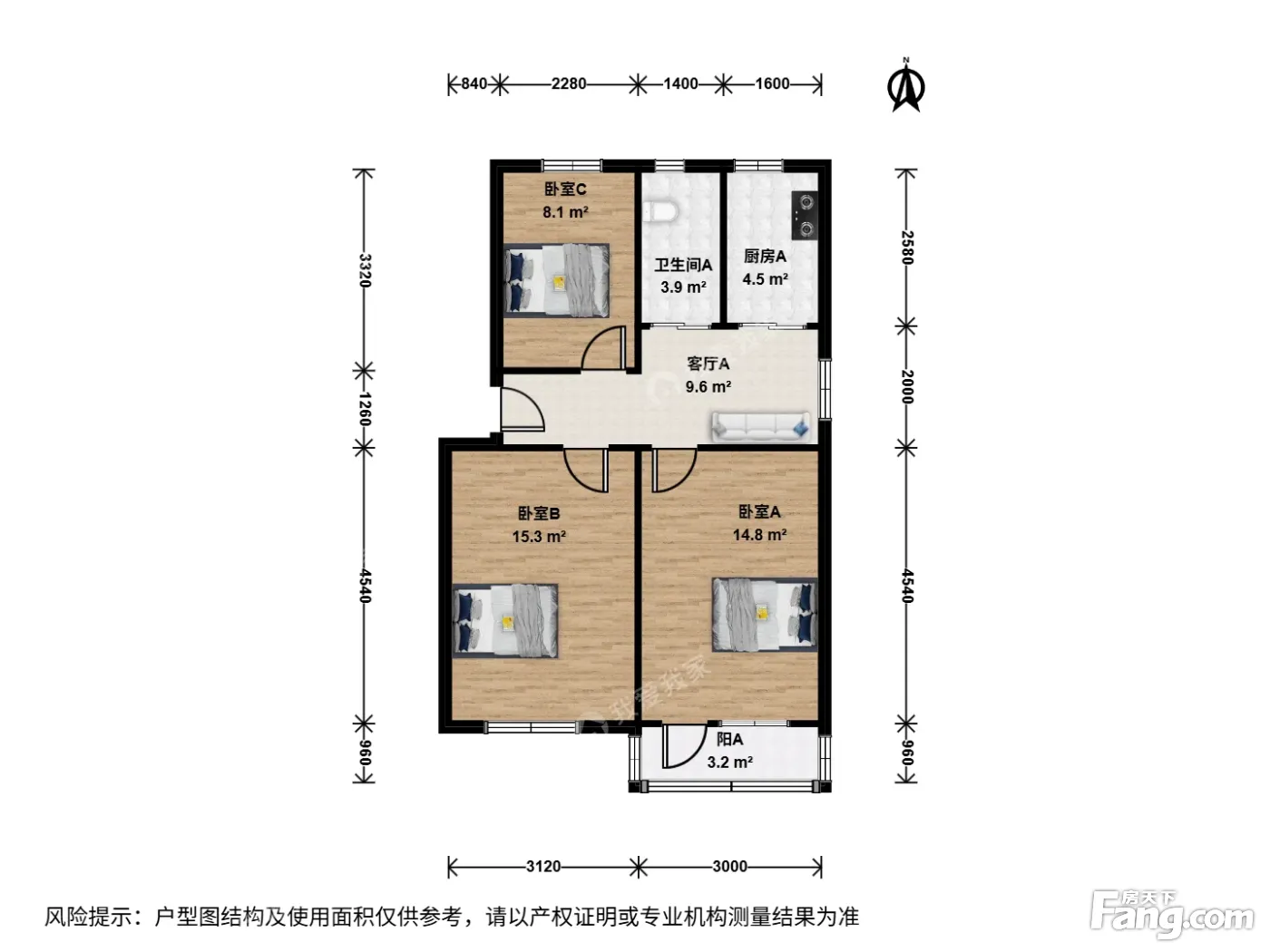 户型介绍:此房户型为3室1厅1卫,建筑面积为71.6平米,朝向为东南北。两大卧室朝南,小卧室朝北,客厅带窗朝东,厨房洗手间朝北,户型好