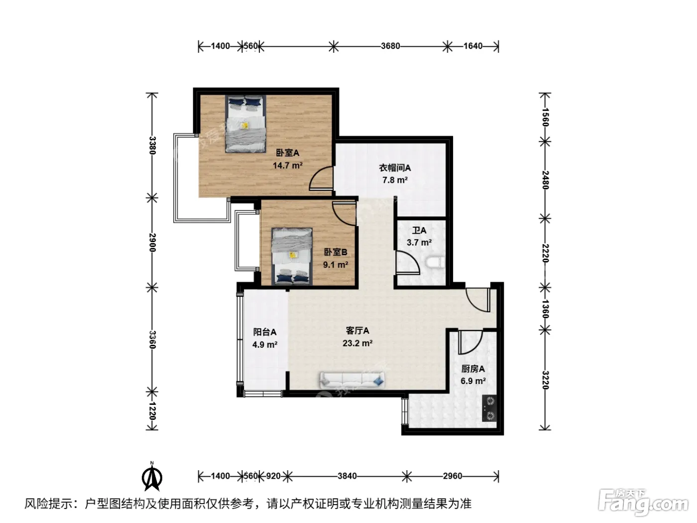 户型齐全,主打户型方正,明厨,独立衣帽间,主卧朝南二居