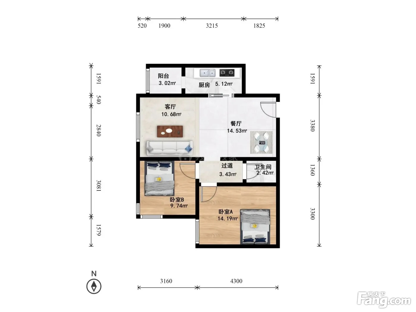 户型齐全,主打客厅朝南二居