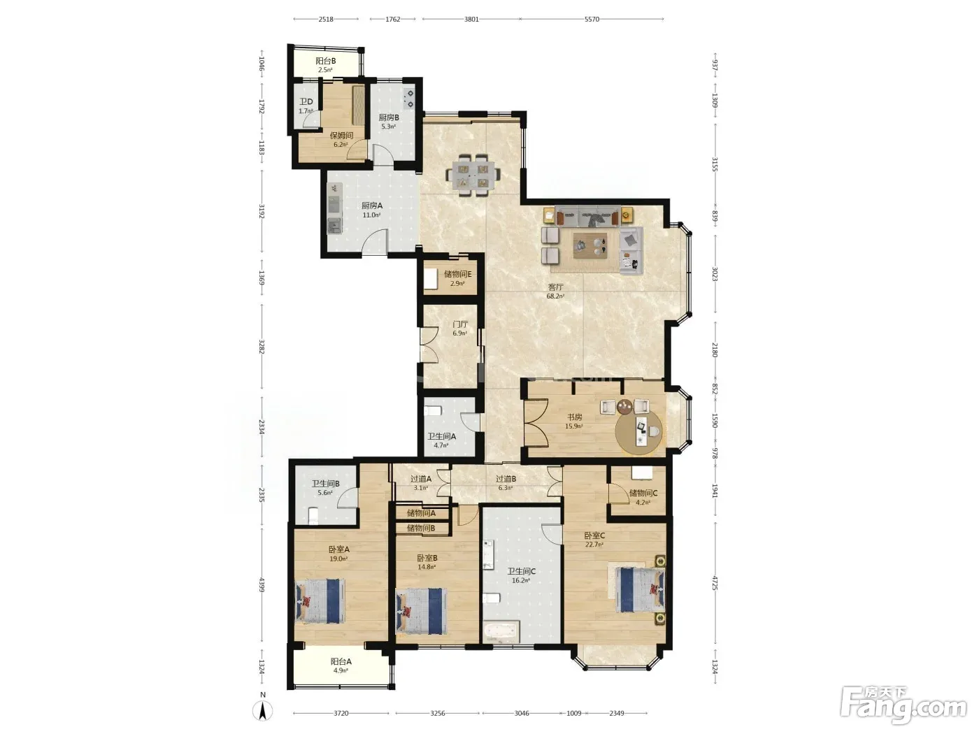 户型简介: 房子是346平的,平层,四室两厅四卫,主卧室南向,带独立卫生间,衣帽间;南向双次卧,其中一个带储物间;东向大次卧,景观庆丰公园,小区花圆;东向大客厅,采光好;北向餐厅,通风好;中西双厨;里边是保姆间,带独立卫生间,户型方正,功能齐全。 理由 理由一 国贸永安里通用国际,周边配套全,成熟社区 理由二 东南北通透,采光好,阳光充足 理由三 高楼层,视野开阔,采光时间长