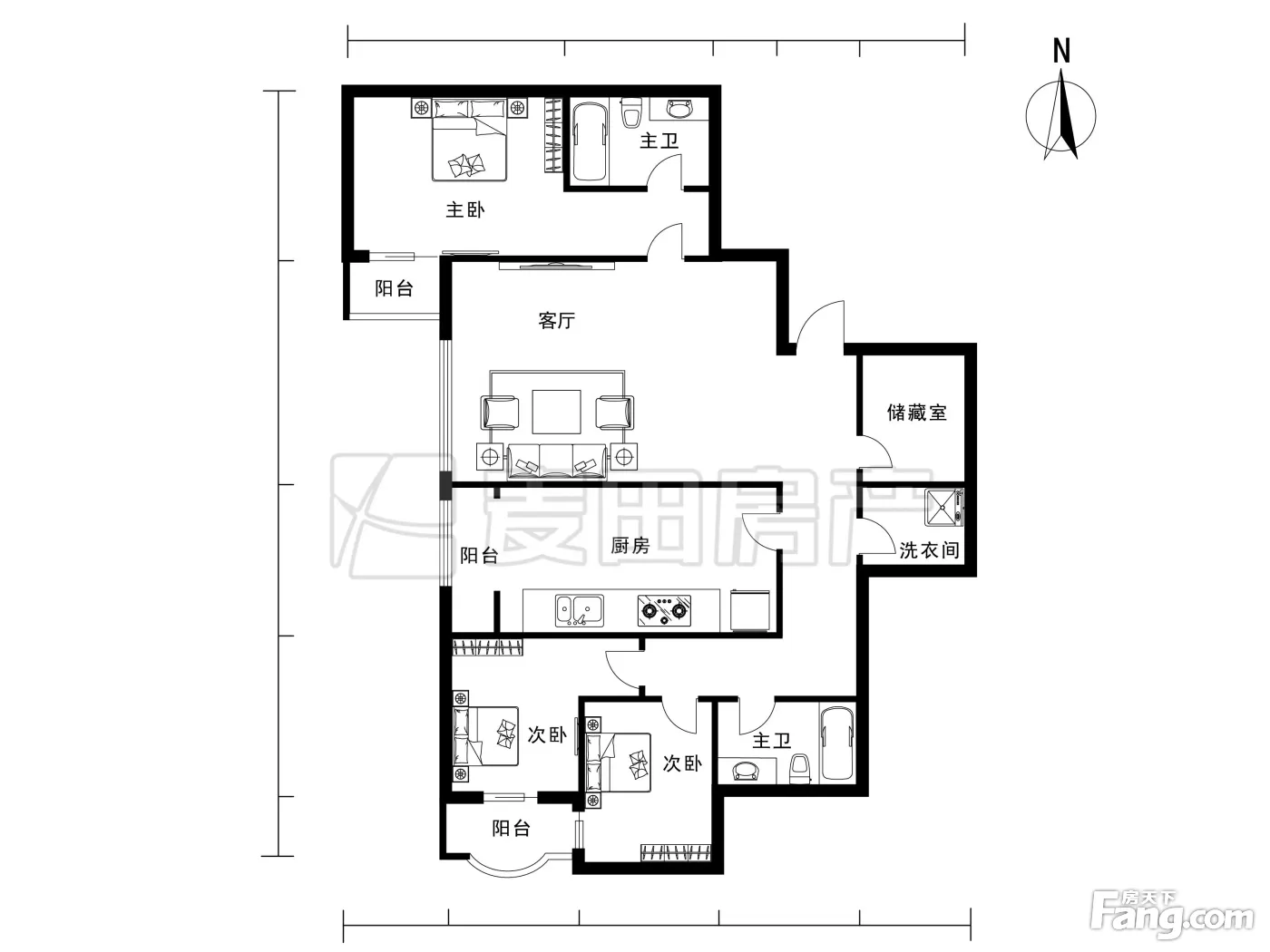 主卧客厅朝南,两个次卧和厨房朝北,南北通透客厅带一个6.4平的外置阳台,客厅面宽4.8米,主卧面积17.8平,北向大次卧13.7平,次卧9.7平L型厨房大约15平