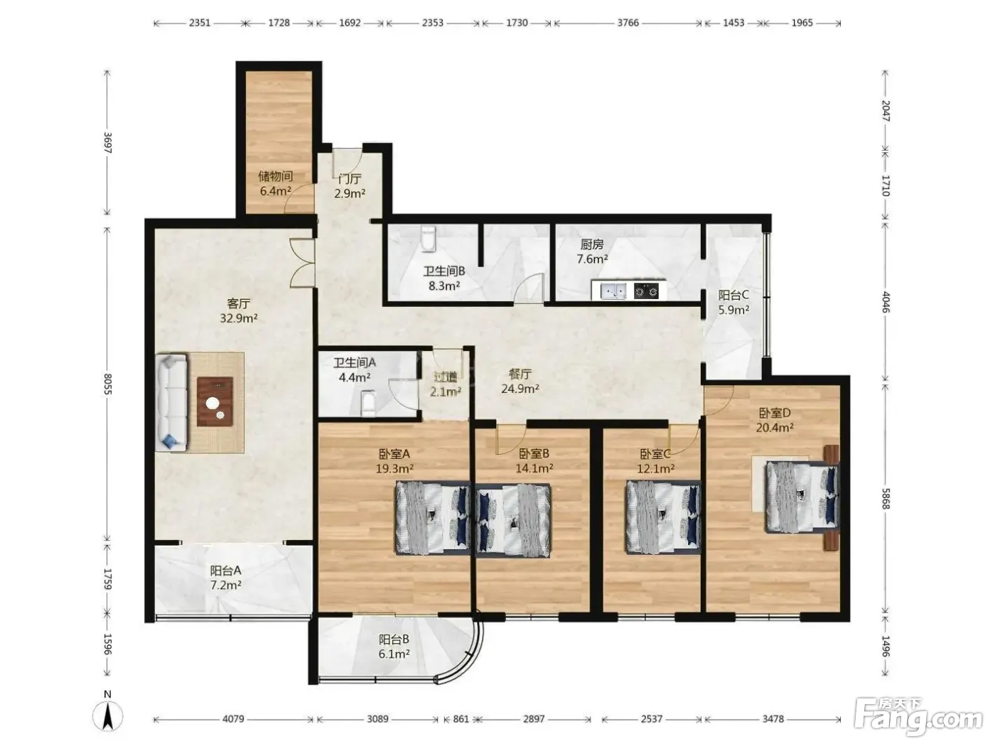 核心卖点:中间楼层,四个卧室,客厅全朝南