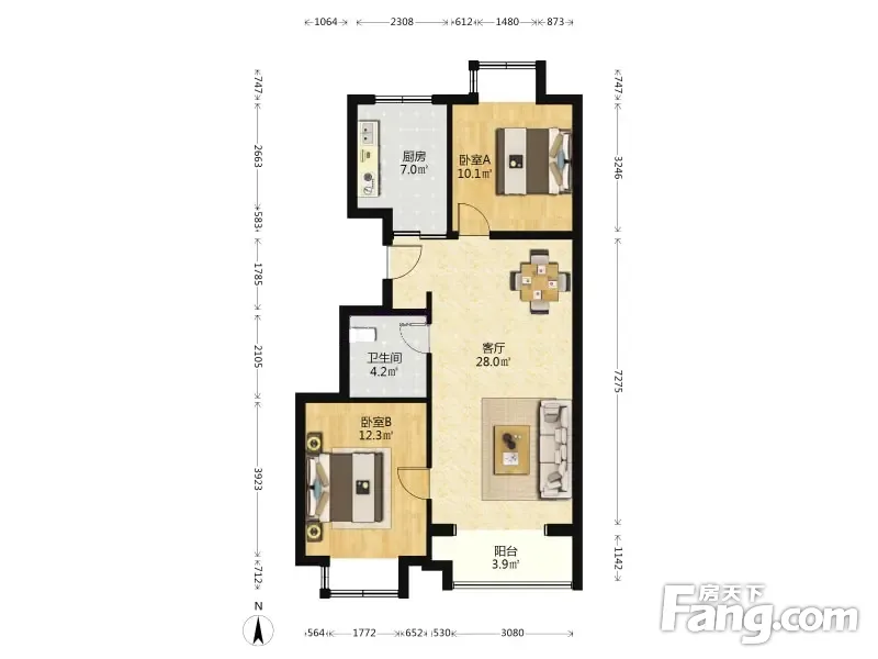 户型齐全,主打户型方正,明厨,客厅朝南,双卧朝南,主卧朝南二居