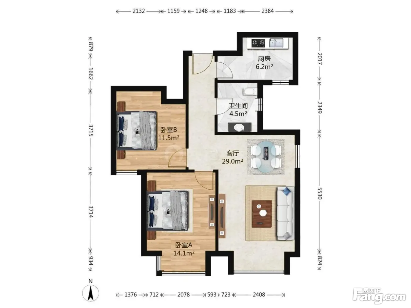 户型齐全,主打南北通透,客厅朝南二居