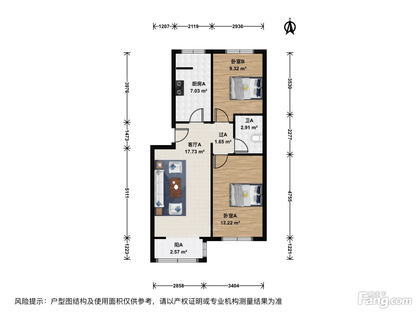 户型介绍:客厅带落地大阳台朝南;舒适主卧室朝南;次卧室朝北;厨房朝北;南北双通透户型